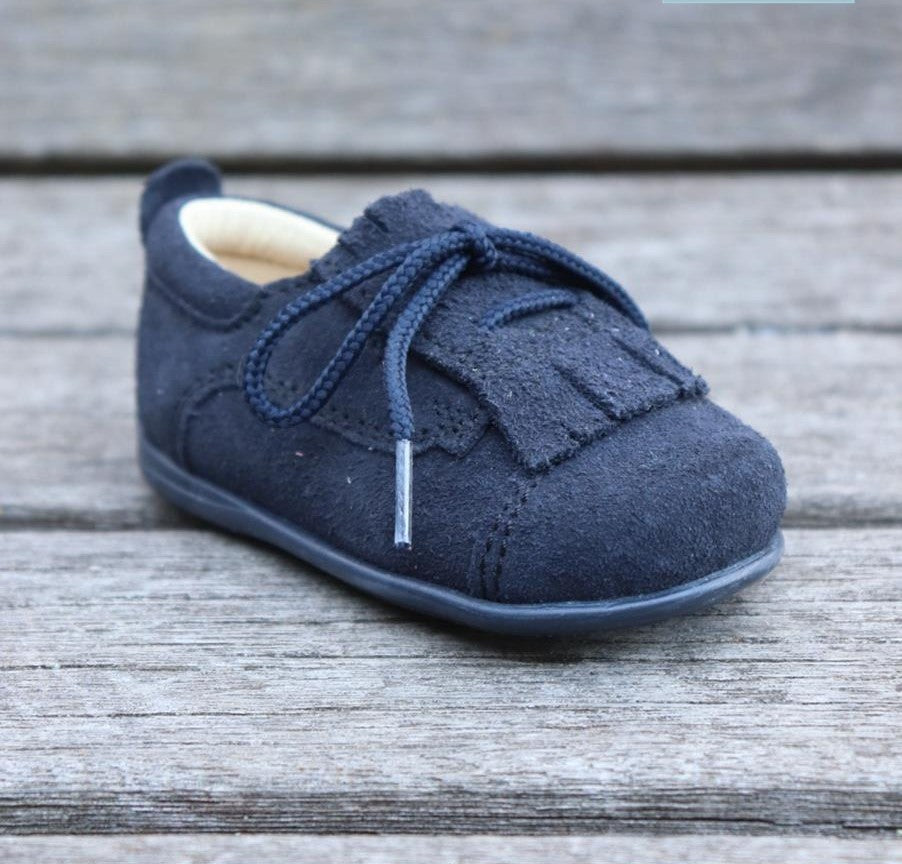 Carneiras em camurça com franja e atacadores. Com sola mole e flexível indicado para os primeiros passos. Pode retirar a franja, tornando o sapato mais versátil.