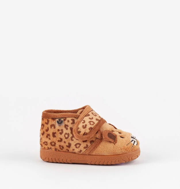 Pantufas Victoria com motivos de animais para crianças. Fabricados em Espanha em pelo curto muito suave e agradável. Fecho com velcro para facilitar o calçar e a autonomia.