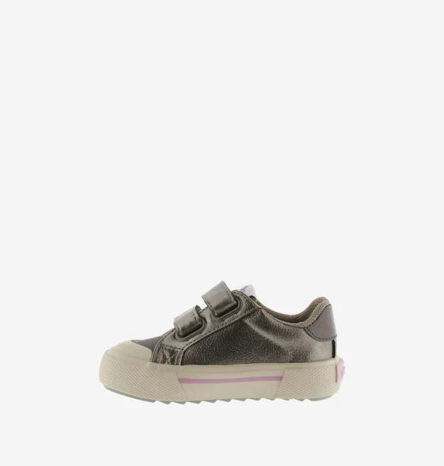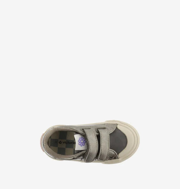 Sapatilhas de corte baixo para meninas em material com efeito pele metalizada. Logótipo da victoria na lateral em glitter. Fecho com duas tiras aderentes que facilitam o calce e promovem a autonomia. Sola em borracha dentada com reforço na biqueira para maior resistência e durabilidade.